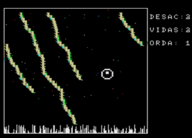 Simple y tonto juego, que sin embargo funciona guay, es rápido y os permitiría tener un rato simpático con vuestro MSX. Se juega con cursor y hay que interceptar los rayos que caen sobre los tejas de las ciudades. Cada nivel incrementa la dificultad y aparece un ovni que pondrá las cosas un poco mas difíciles.